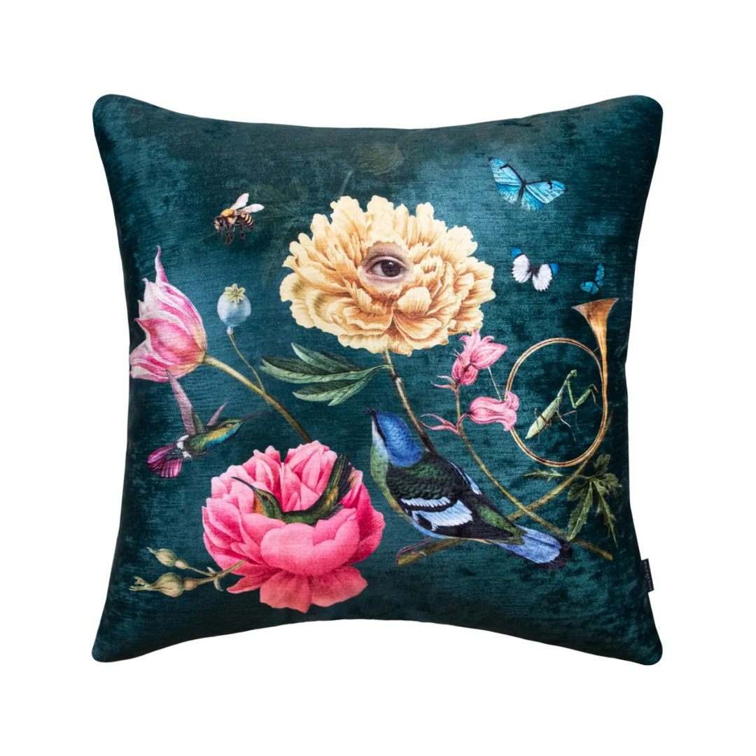 Confeccionado en terciopelo y decorado con una impresión de sublimación, este diseño ofrece un toque único a tus espacios. Combínalo con su diseño complementario.